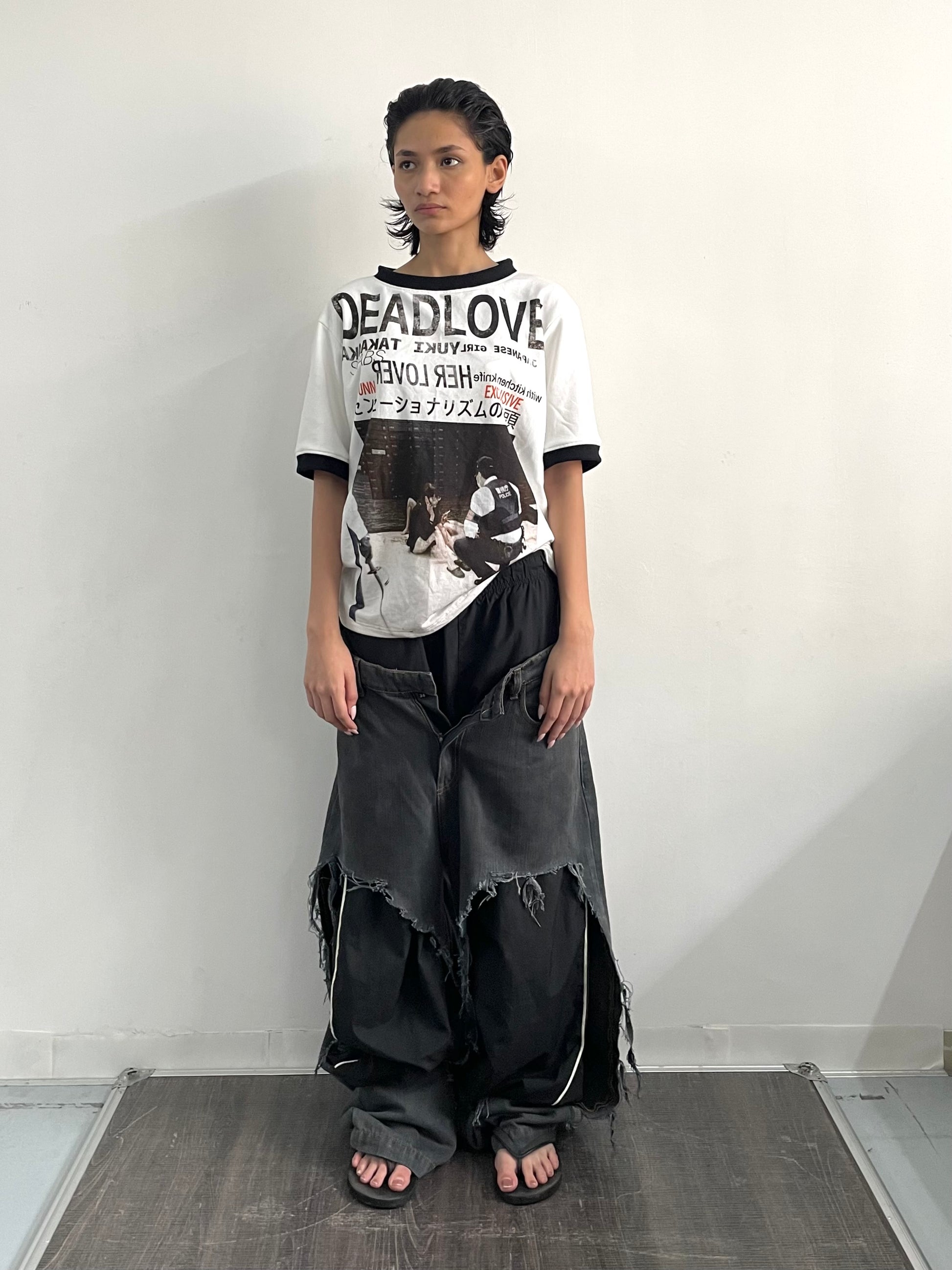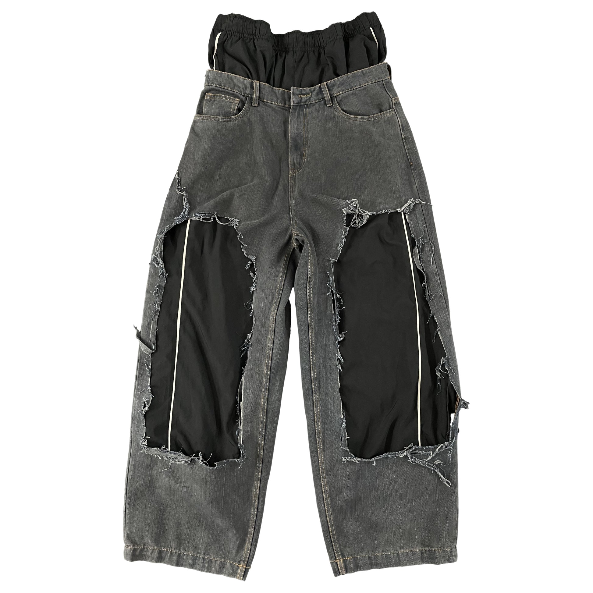 - Layered with upcycled trackpants